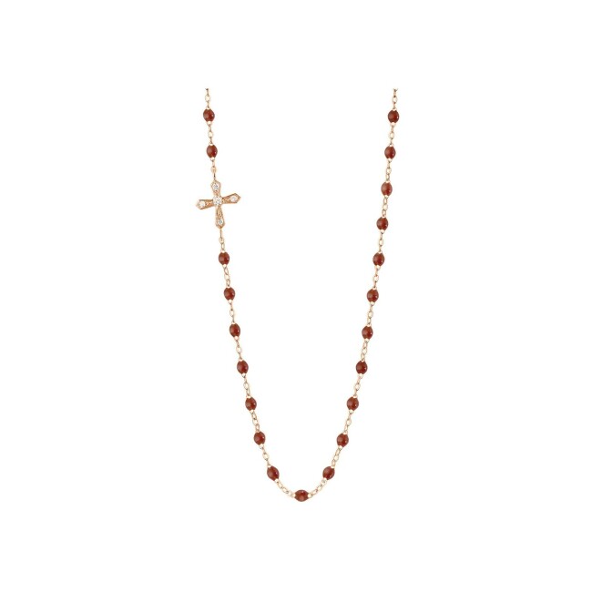 Collier Gigi Clozeau Croix Vintage en or rose, résine moka et diamants, taille 42cm